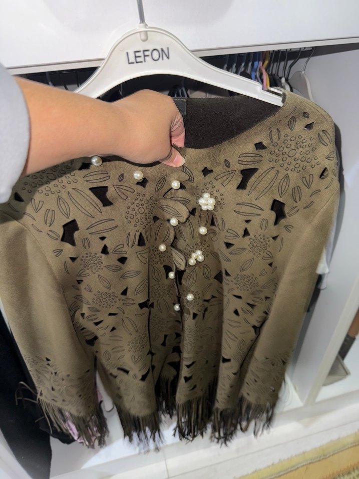 Yeşil incili güpür süet bohem tarzı kadın şal, düğme detaylı ve püsküllü. Çiçek desenleri ve inci süslemeleri ile modaya uygun. Marka: LEFON.