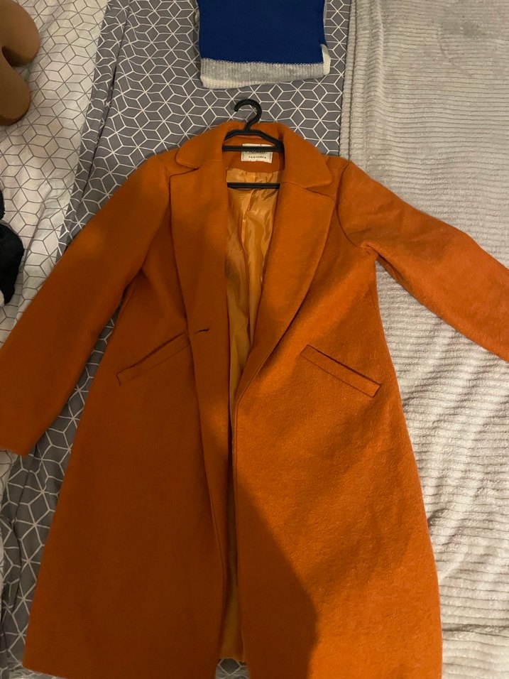 Düğmeli süet midi kaban, kesik yakalı, uzun kollu, parlak görünümlü ve normal kesime sahip, ofis için uygun. Alındığından beri sadece bir kere giyildi her hangi bir defosu yok %30 yün