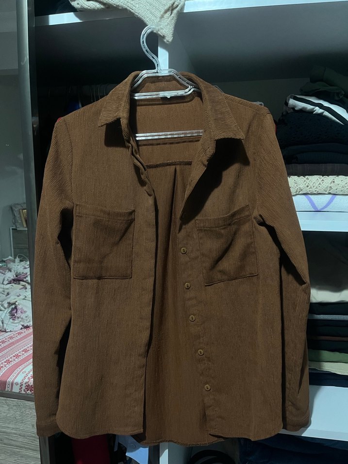 Taba keten gömlek, düğmeli ve kesik yakalıdır. Bol kesim, uzun kollu ve midi boydadır. Günlük sokak stili için uygundur. İki ön cep bulunur.