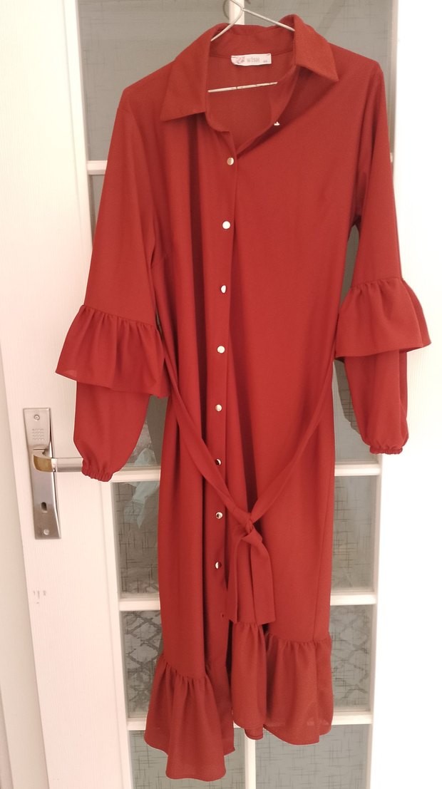 Düğmeli, bol kesim uzun kırmızı elbise, uzun kolları volanlı ve yakası kesik yaka. Parlak sentetik kumaştan, bohem Paris tarzı yansıtıyor. Günlük kullanıma uygun.
