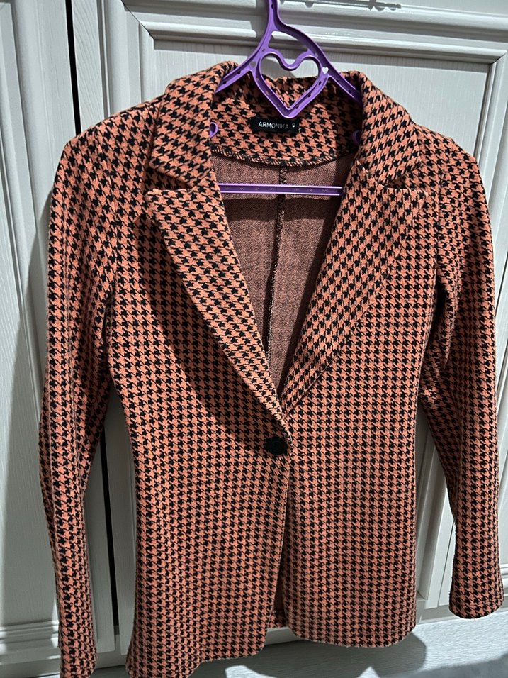 Tarçın- siyah kazayağı düğmeli kadın blazer ceket, kesik yakalı ve uzun kollu. Normal boyda, sentetik kumaştan, ofis için uygun şık ve rahat bir model.