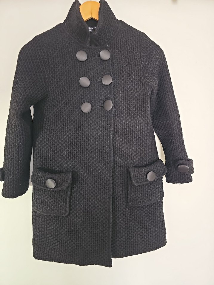 Düğmeli, triko kumaştan yapılmış, uzun kollu ve normal boyda, kiz cocuk kabanı. Koyu gri renkte, çentikli yaka ve iki cep bulunur.