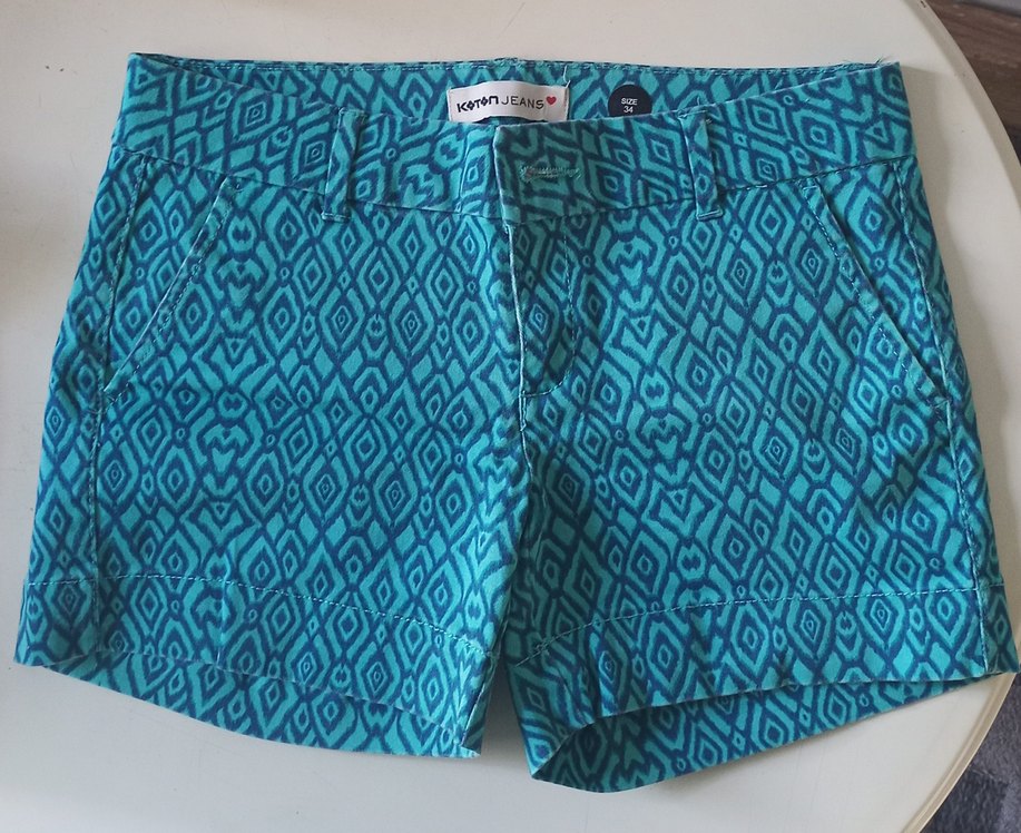 Sentetik kumaştan, düğmeli ve batik desenli turkuaz hamile şortu, bohem tarzda, dış mekan kullanımı için uygundur.