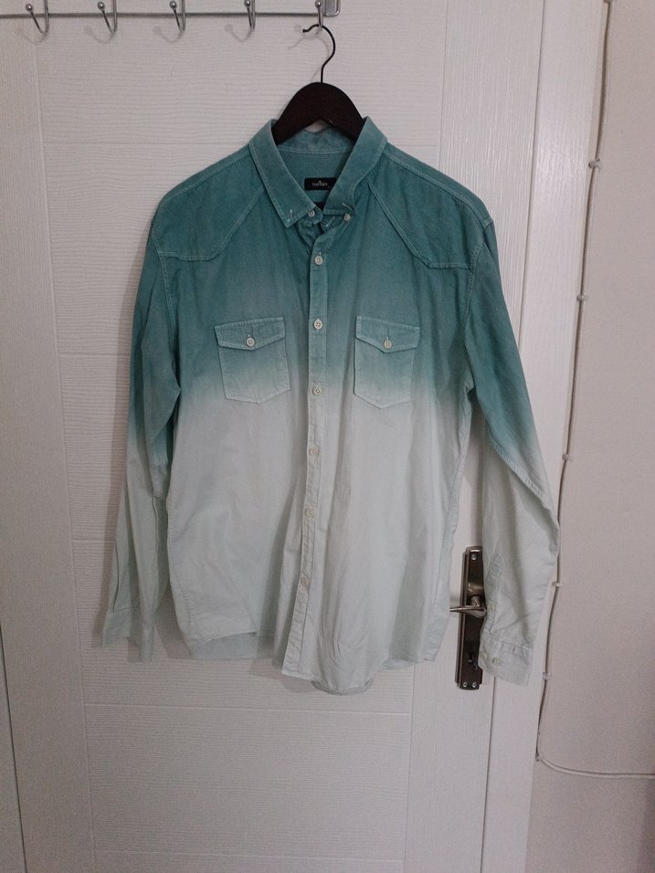 Düğmeli, yakalı, uzun kollu erkek gömleği. Turkuaz batik desenli denim kumaştan, bol kesim ve günlük rahat stil sunar.