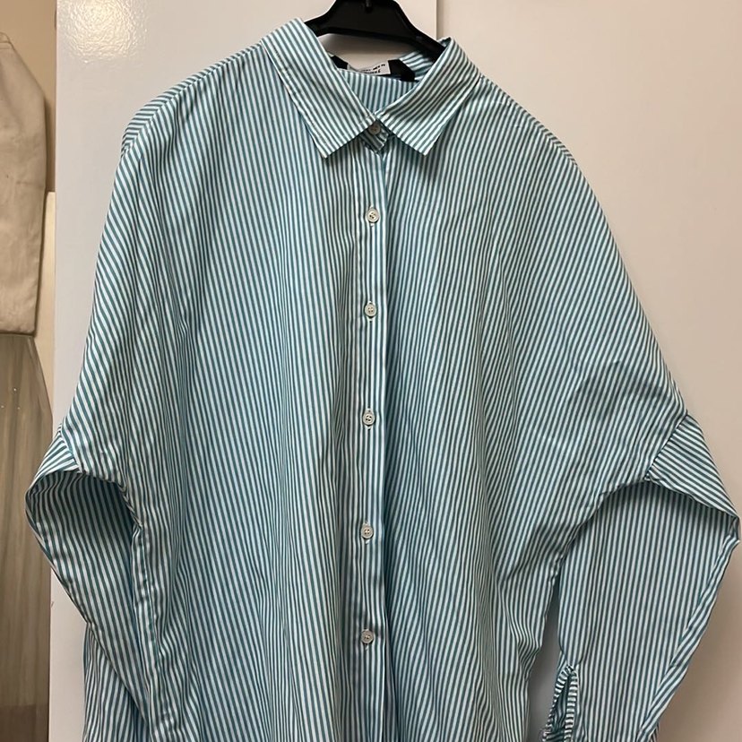 Pamuklu, uzun kollu, yakalı kadın gömleği. Turkuaz ve beyaz çizgili desene sahip, düğmeli ve normal kesimdir. Ofis için uygundur.