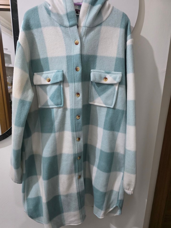 Yumuşak ve sıcak kumaştan, düğmeli, uzun kollu, notlu yakalı, turkuaz pastel ekose desenli, bol kesim ve midi uzunlukta kadın gömlek.