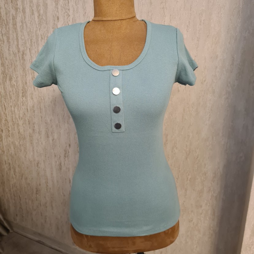 Turkuaz renk, düğmeli ve kısa kollu, vücuda oturan hamile tişörtü. Düğmeli detaylı yuvarlak yaka ve rahat sentetik kumaştan üretilmiştir.