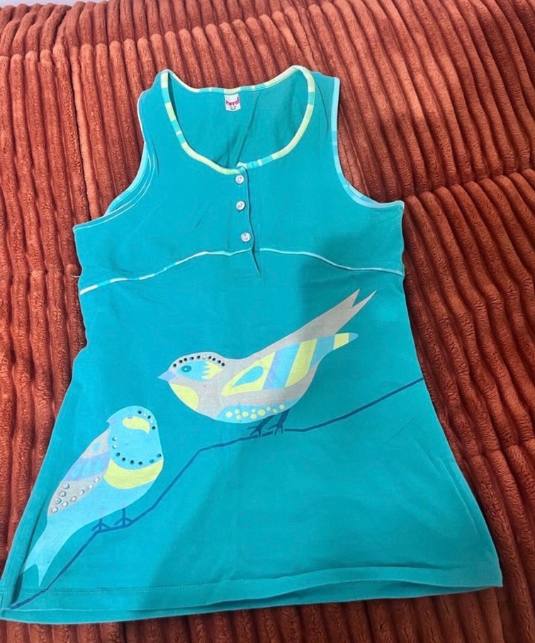 Düğmeli, kolsuz turkuaz hamile tunik, straplez yaka ve renkli kuş baskılı. Salaş kesim, normal midi boyda, günlük kullanıma uygun.