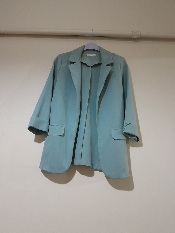 Turkuaz renk, düğmeli, uzun kollu kadın blazer ceket. Notlu yaka, normal boy, sade ve desen içermeyen tasarıma sahip. Ofis için uygun, sentetik yumuşak kumaştan. iki kol arası 46 santim boy uzunluğu 68 santim