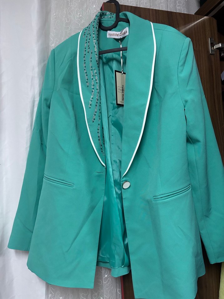 Düğmeli, turkuaz renkli, notlu yaka ve uzun kollu kadın blazer. Normal midi boyda, sentetik kumaştan, iş ortamı için uygun.