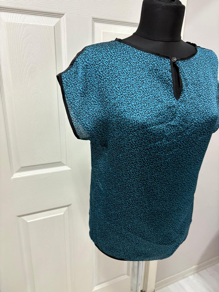 Düğmeli yakası, kısa kollu, parlak sentetik kumaştan turkuaz renkte, bol kesim ve baskılı desene sahip kadın bluz, günlük kullanıma uygundur.