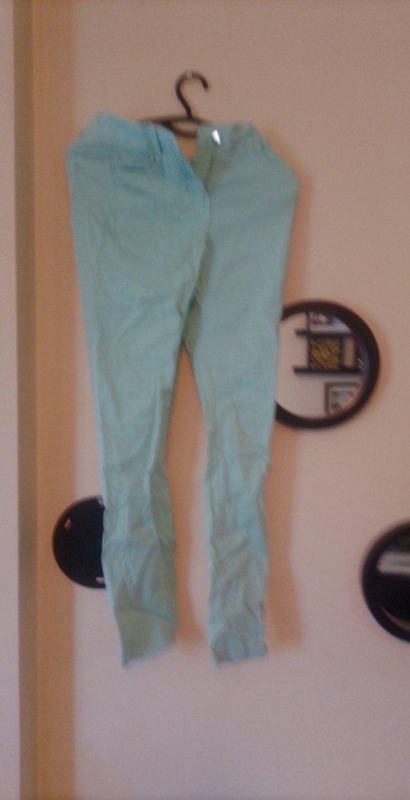 Düğmeli ön kısmı ve midi boyuyla turkuaz renkli, kadınlara özel dar kesim denim pantolon. Günlük ve sokak stiline uygundur.