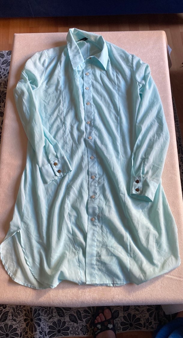 Pastel turkuaz renginde, yumuşak kumaştan üretilmiş, düğmeli, uzun kollu, yakalı ve midi boyda bol kesim gömlek. Rahat günlük kullanım için uygundur.
