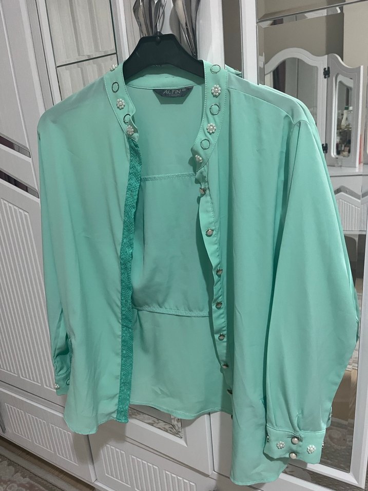 Düğmeli, uzun kollu, yakalı turkuaz gömlek. İpek gibi dokusu ve rahat kesimiyle günlük sokak stiline uygundur.