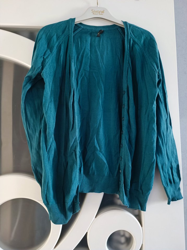 Yumuşak keten kumaştan, düğmeli, turkuaz renkli, uzun kollu ve yuvarlak yakalı bol kesim hırka. Günlük rahat kullanım için uygundur.