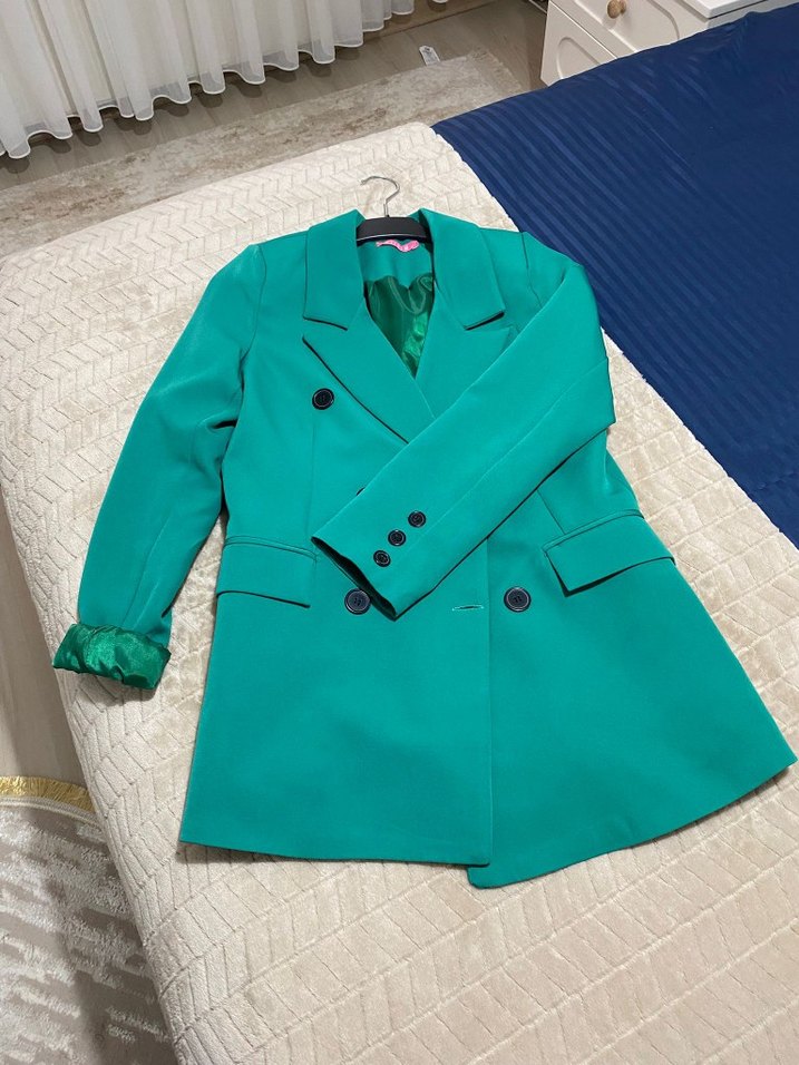 Düğmeli, uzun kol ve kesik yaka özellikli turkuaz uzun blazer ceket, rahat kesim ve yumuşak dokulu kumaştan üretilmiştir.