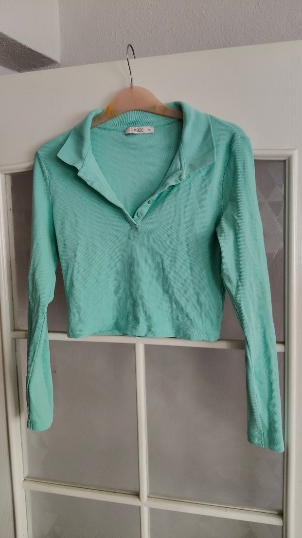 Düğmeli, uzun kollu ve yakalı bu kadın trikosu, yumuşak keten kumaştan pastel turkuaz renkte, günlük kullanım için uygun rahat bir sokak stili sunar.