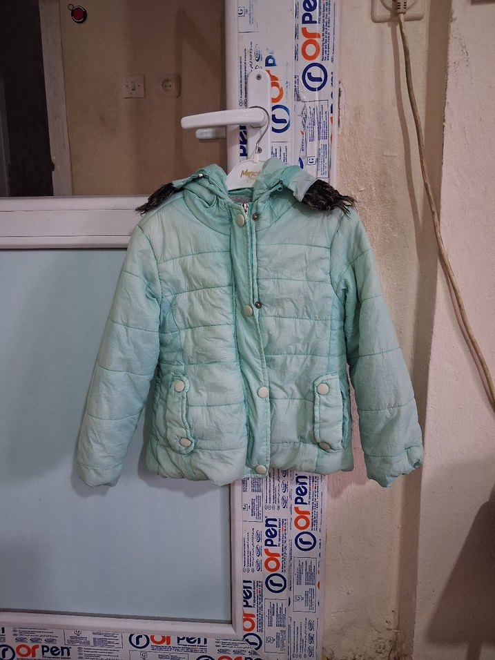 Yumuşak fleece kumaştan yapılmış, düğmeli ve yakası kesikli, turkuaz renkli, sokak tarzı uyumlu kız çocuk montu.