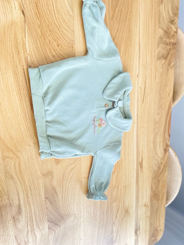 Uzun kollu, düğmeli, yakalı ve nakışlı turkuaz kız sweatshirtü. Yumuşak ve sıcak kumaştan, bol kesim ve pastel renkte, sokak stili için uygun.