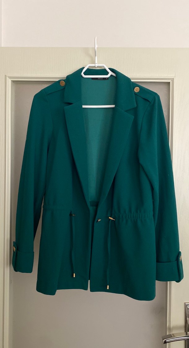 Düğmeli detaylı, yakalı turkuaz midi blazer. Uzun kollu, normal kesim ve sentetik kumaştan üretilmiştir. Ofis için uygundur. Hafif kusurları var