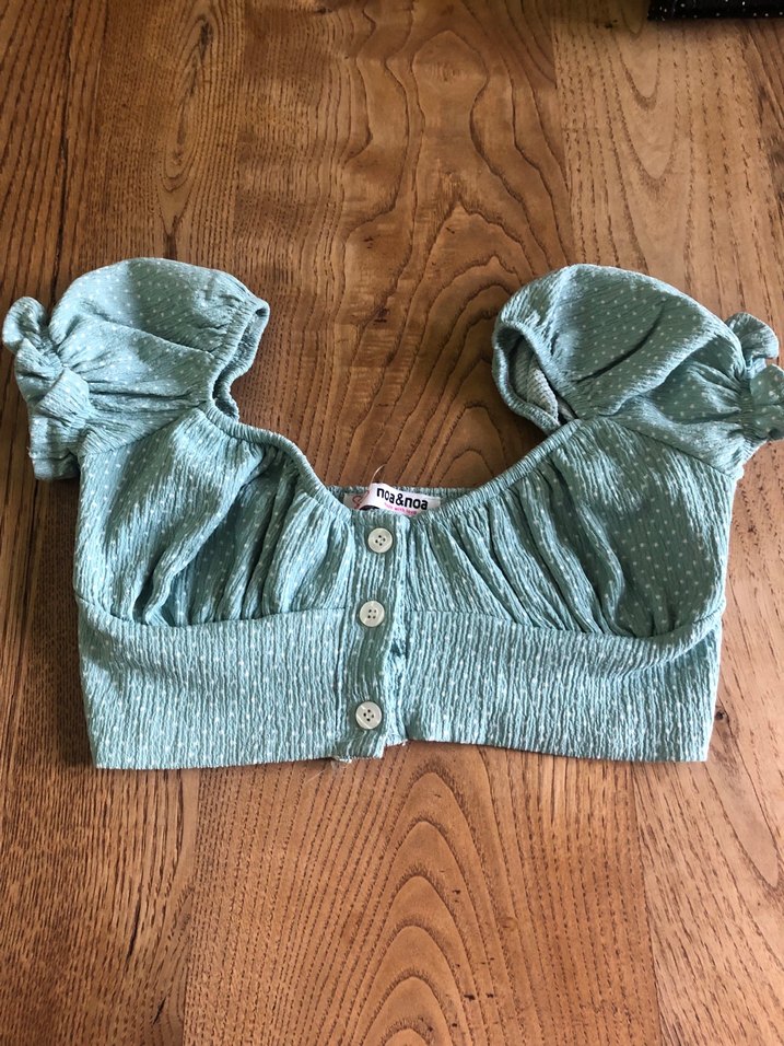 Düğmeli ön kısmı ve kayık yaka detaylı, turkuaz renkli, kısa ve askılı kollu, bohem tarzda, kumaştan mini bluz.