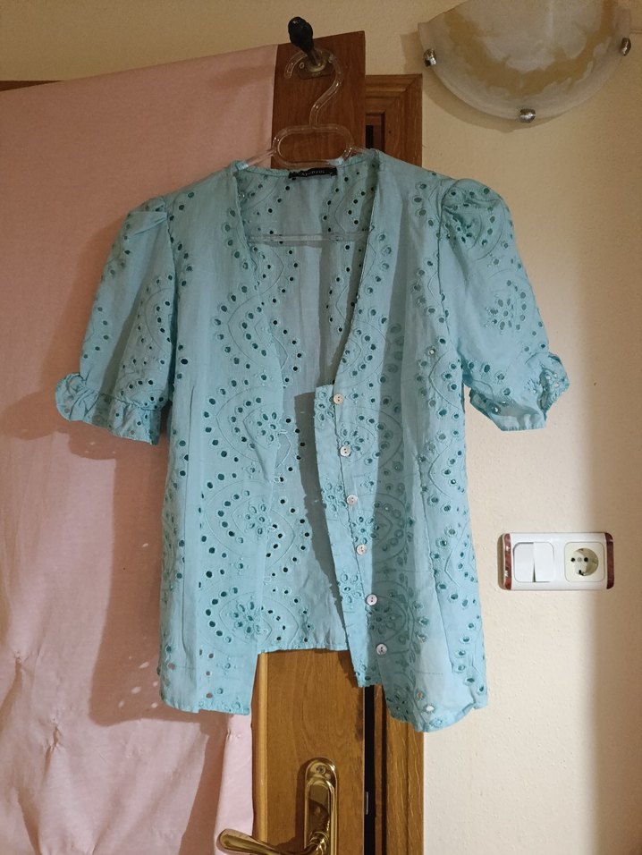 Turkuaz pastel renkte, nakışlı ve düğmeli, kısa kollu, bol kesim hamile bluzu. Keten kumaştan, notlu yakalı, günlük kullanım için uygun.