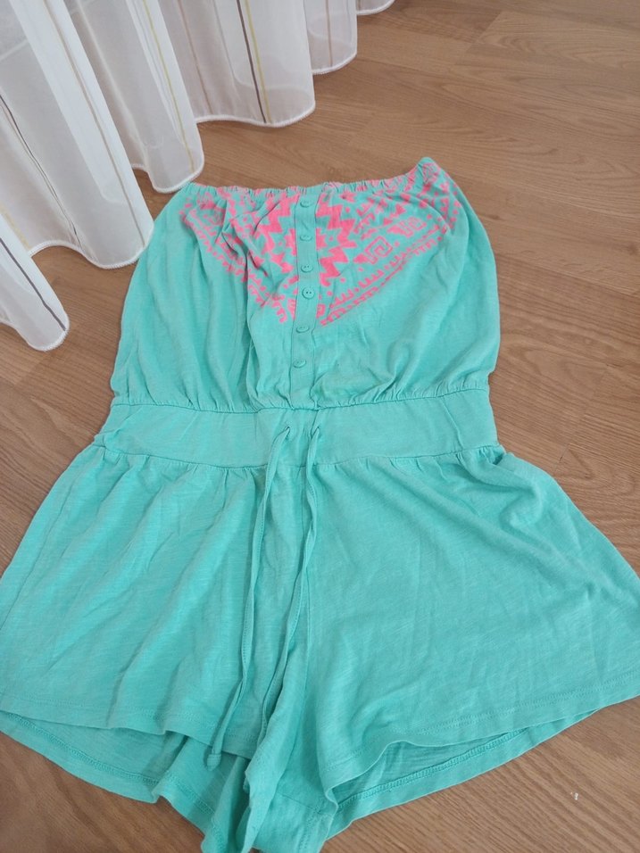 Düğmeli, nakışlı desenlere sahip turkuaz pastel tonlarında, bol kesim ve straplez hamile tulumu, yumuşak sentetik kumaştan.