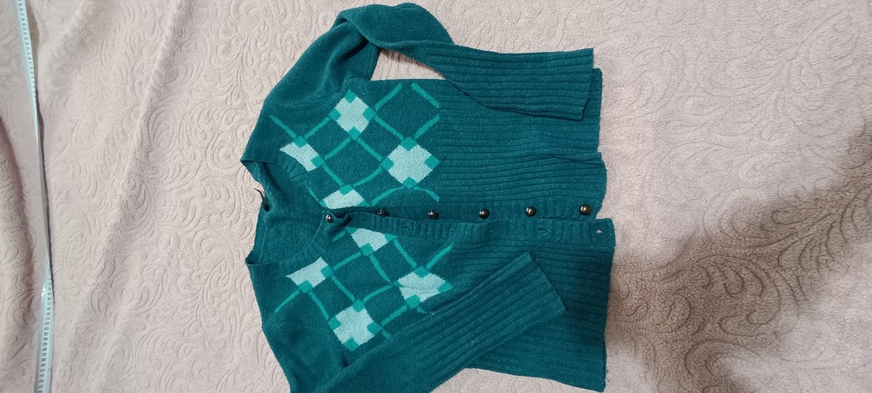 Düğmeli önü ve kesik yakası olan, uzun kollu, normal midi boy, turkuaz triko hamile hırkasıdır. Rahat ve günlük kullanıma uygundur.