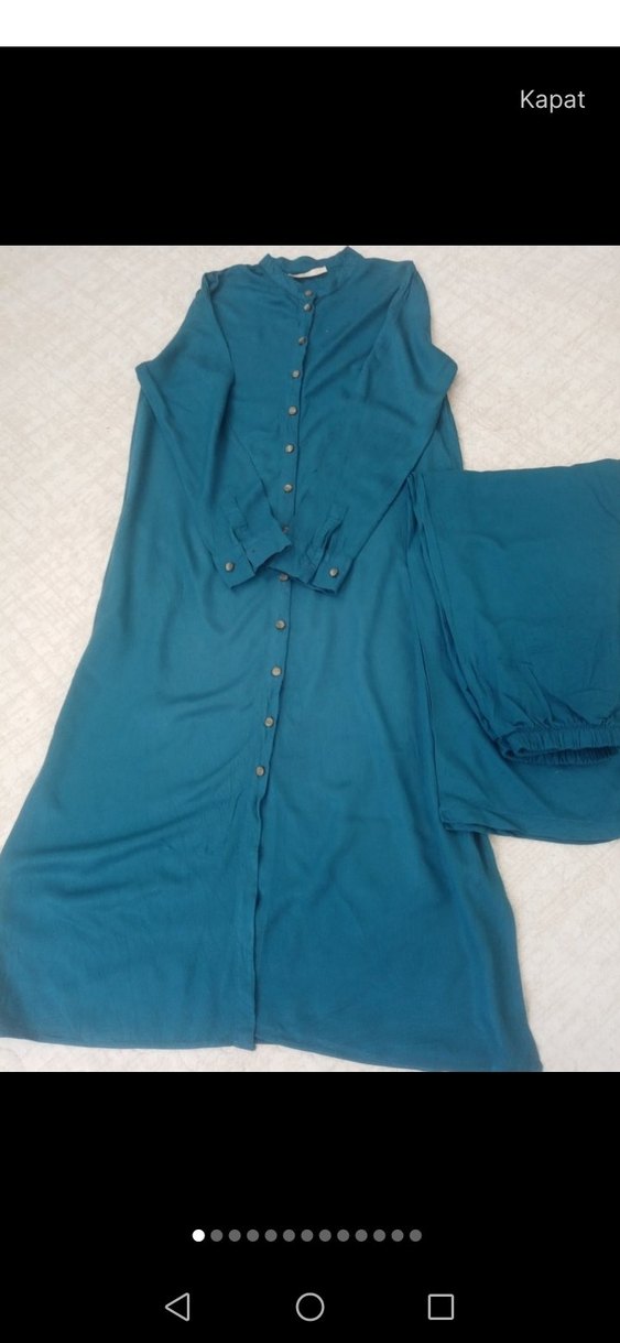 Turkuaz renkli, uzun kollu, düğmeli, bol kesim ve yakalı uzun elbisedir. Yumuşak sentetik kumaştan yapılmış, minimal bohem tarzda günlük kullanıma uygundur.
