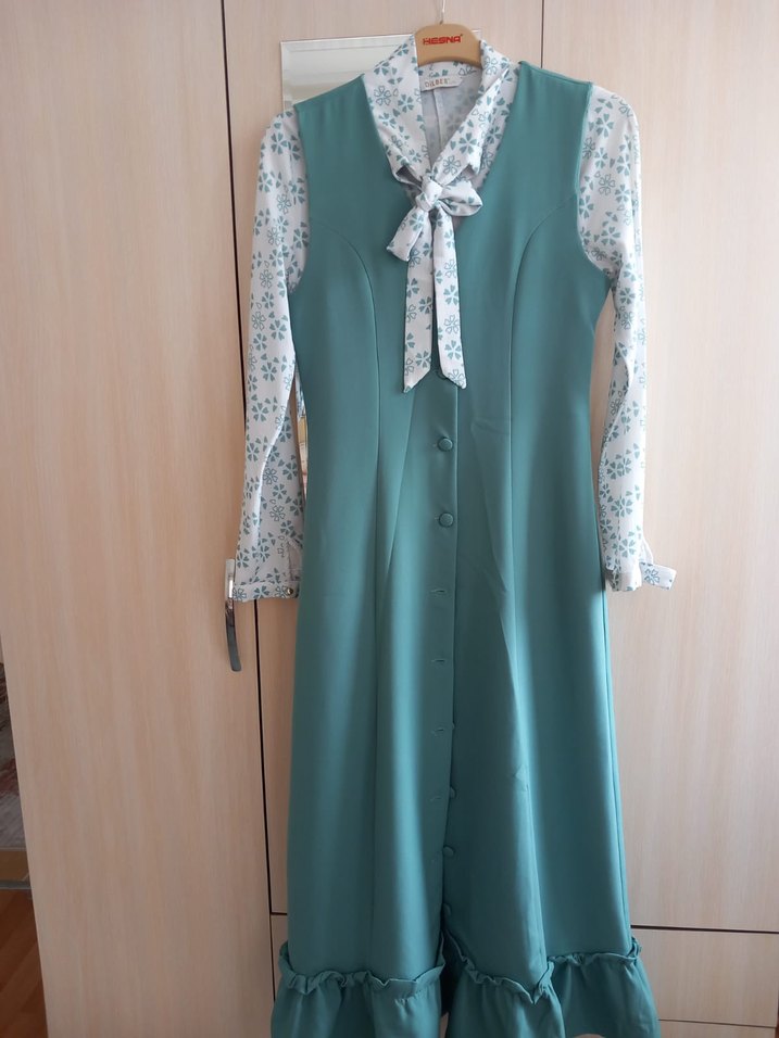Düğmeli, askısız yakalı turkuaz uzun elbise. Düz renk, sentetik kumaştan, regular fit, ofis için uygun. 40 beden olup 2li takım seklındedır