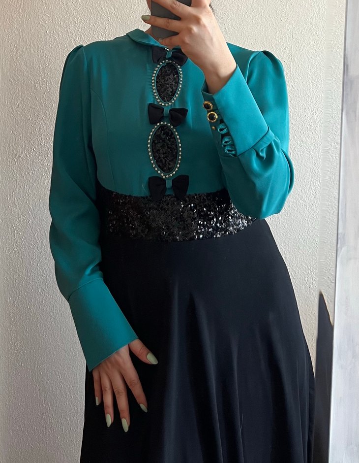 Uzun kollu, yakalı ve düğmeli ön kısmı fiyonk ve nakış detaylıdır. Turkuaz ve siyah renklerde, payet işlemeli şık tasarım. Ofis için uygun gotik tarzda elbise.