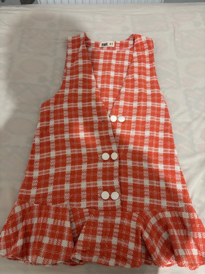 Turuncu beyaz kareli, düğmeli, V yakalı, bol kesim, mini boy ve volanlı etek uçlu kolsuz