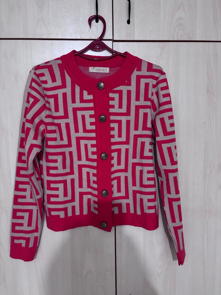 Düğmeli, uzun kollu ve bisiklet yaka turuncu renkli, desenli kadın hırka. Normal boyda, midi uzunlukta ve sentetik kumaştan yapılmıştır.
