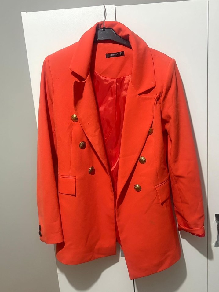 Düğmeli, kırmızı renkte kadın blazer ceket. Normal boyda, regular fit ve sentetik kumaştan üretilmiştir. Notch yakalı, askılı kolludur.