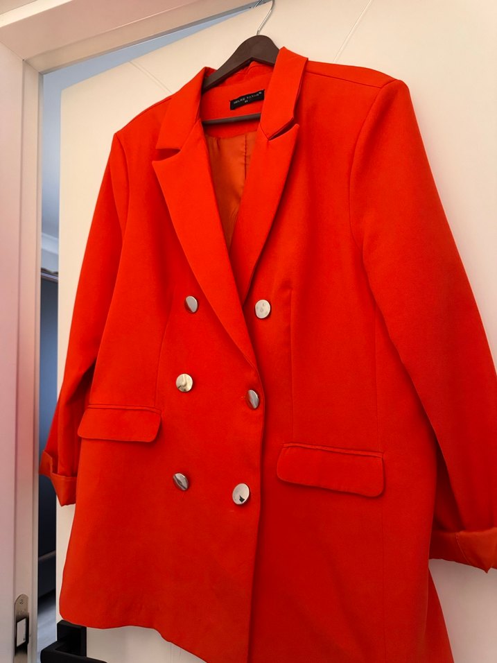 Düğmeli, kırmızı kadın blazer ceket, keskin yaka ve uzun kolludur. Normal boyda, rahat kesimli ve parlak dokulu yumuşak kumaştan üretilmiştir. 1 kere kullanıldı 1 düğmesi soyulma yaptı değiştirilebilir