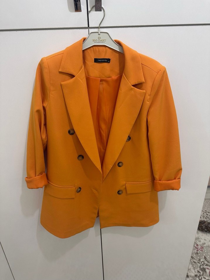 Parlak turuncu renkli mini blazer, düğmeli ve kesik yaka detaylıdır. Askılı kol ve normal kesim ile ofis ya da günlük kullanıma uygundur.