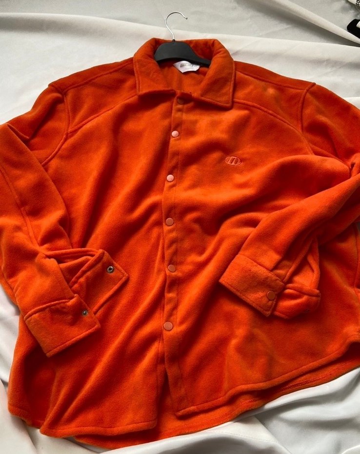 Düğmeli, uzun kollu ve yakalı turuncu kadın polar gömlek. Rahat kesimi ve parlak rengiyle günlük sokak stiline uygundur.