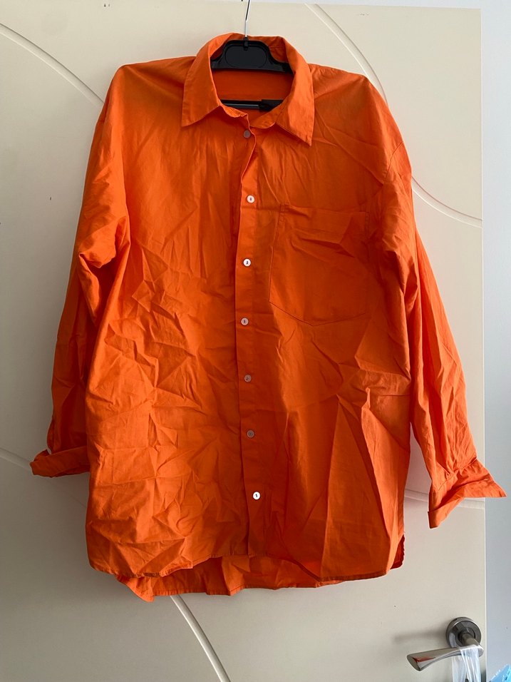 Turuncu renkte, keten kumaştan, düğmeli ve uzun kollu, yakalı, rahat kesim midi uzunlukta kadın gömleği. Günlük kullanıma uygun.