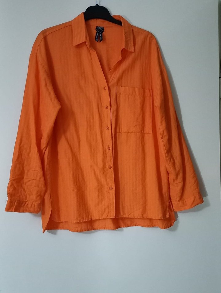 Düğmeli, uzun kollu turuncu keten gömlek, yakalı ve bol kesim, günlük rahat sokak stili için uygundur.