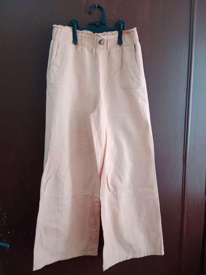 Düğmeli, palazzo fit turuncu keten pantolon, günlük kullanıma uygun rahat ve sade. Işıktan rengi farklı görünüyor ama turuncu renktedir.