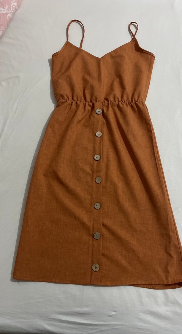 Keten kumaştan, düğmeli ön detaylı, askısız ve kolsuz turuncu midi elbise. Bel kısmı büzgülü, bol kesim, bohem tarzda günlük kullanım için uygun.