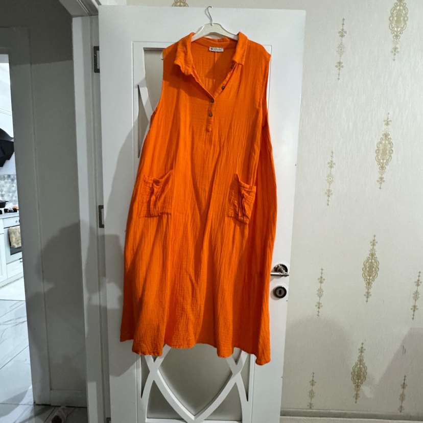 Parlak turuncu keten kumaştan, kolsuz, düğmeli ön ve yakalı uzun elbise. Rahat kesim ve ceplidir, günlük kullanıma uygundur.