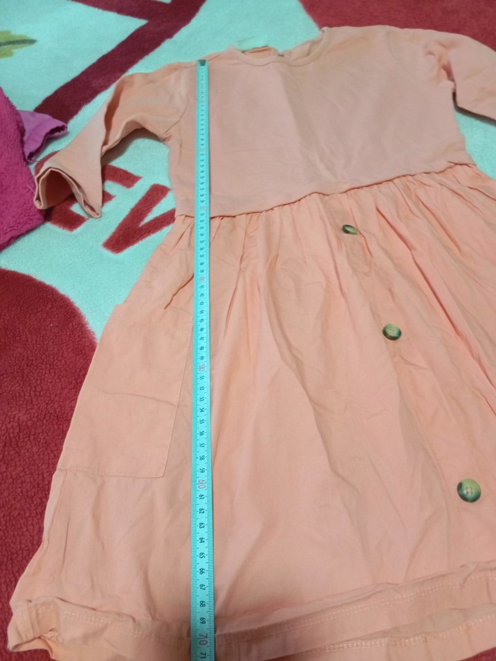 uzun kollu, yuvarlak yakalı kız elbisesi. Düğmeli ve bol kesim, sentetik kumaştan yapılmıştır. LCW 10/11 yaş
