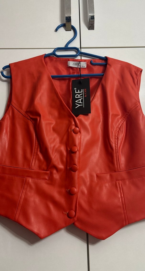 Bu dar kesim turuncu deri yelek, V yakalı ve düğmeli kapamalıdır. Kolsuz ve parlak dokusu ile şık bir sokak stili sunar. Günlük kullanıma uygundur.