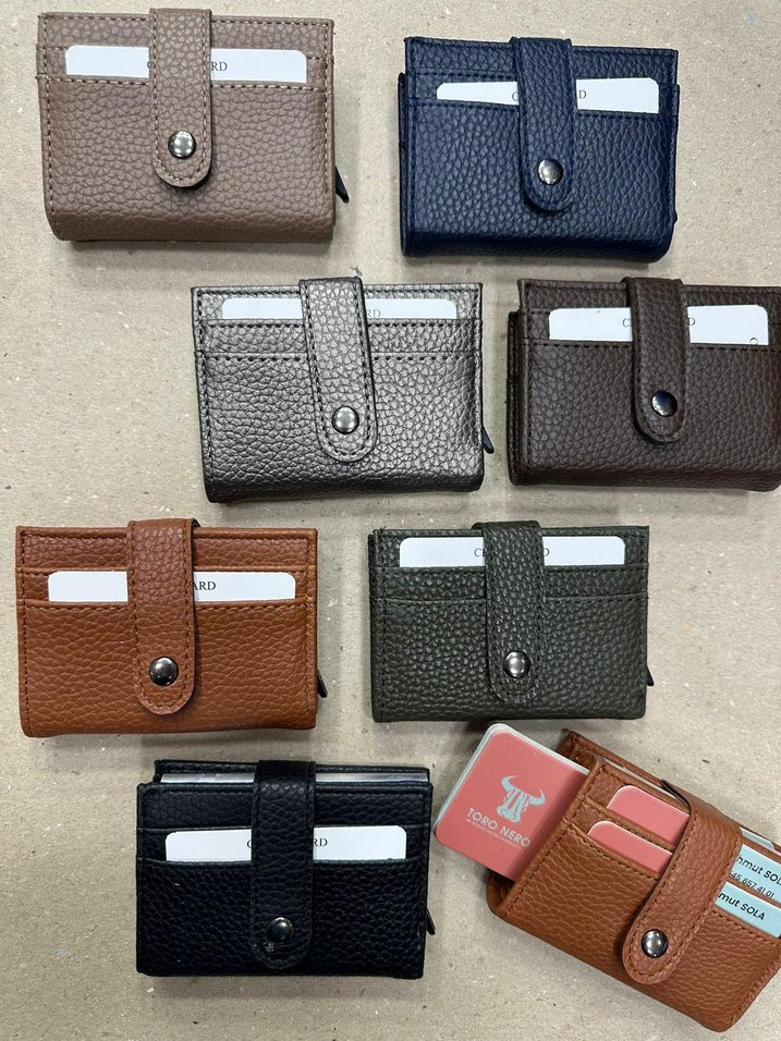 Düğmeli kapaklı, dokulu malzemeden yapılmış unisex kullanıma uygun cüzdanlar. Çoklu kart yuvaları ve kompakt tasarım içerir. Çeşitli mat renk seçenekleriyle.