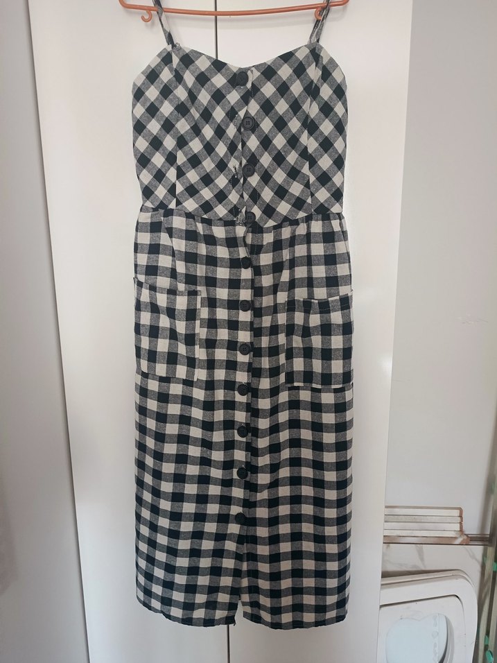 Pamuk kumaştan, düğmeli ve askılı uzun boylu, gri ekose desenli bol kesim elbisedir. Rahat ve günlük sokak stili için uygundur. 2 si bir fiyat