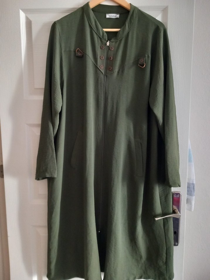 Koyu haki renkli, uzun kesim keten kadın tunik cep kısmı sökük Düğmeli, uzun kollu ve notched yaka detaylarıyla minimal ve rahat bir görünüm sunar.