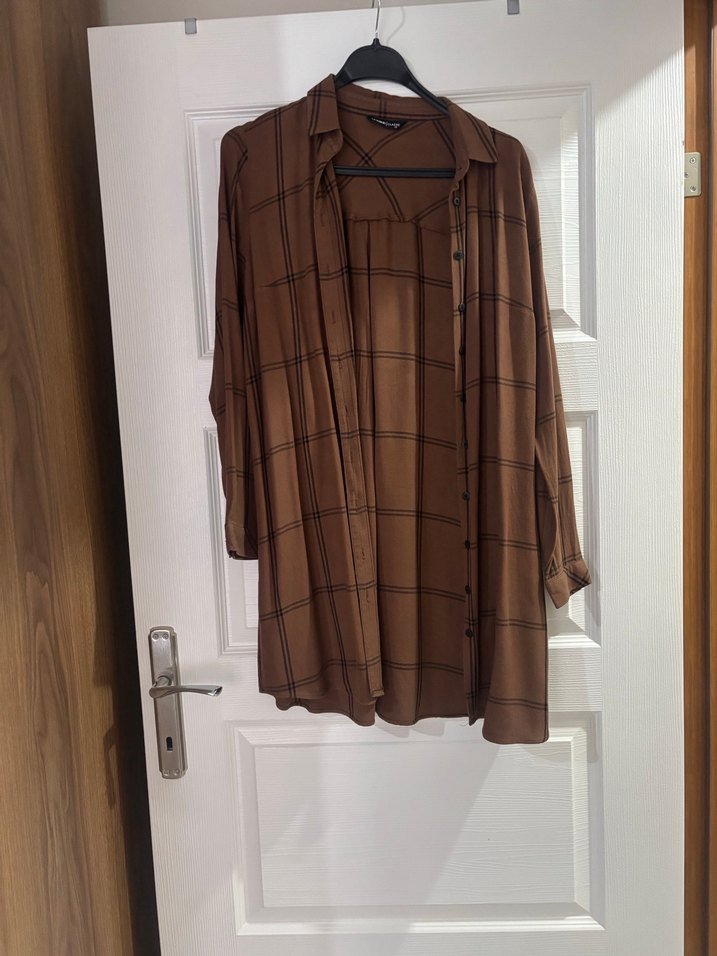 Düğmeli önü ve kırçıllı yakası olan, koyu kareli desenli, sentetik kumaştan yapılmış uzun bej gömlek. Salaş kesimiyle rahat günlük kullanım için uygundur.
