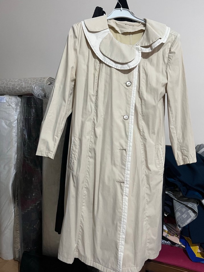 Düğmeli, bej uzun trençkot, keten kumaştan, notched lapel yaka ve uzun kollu. Rahat kesimiyle günlük kullanıma uygundur.