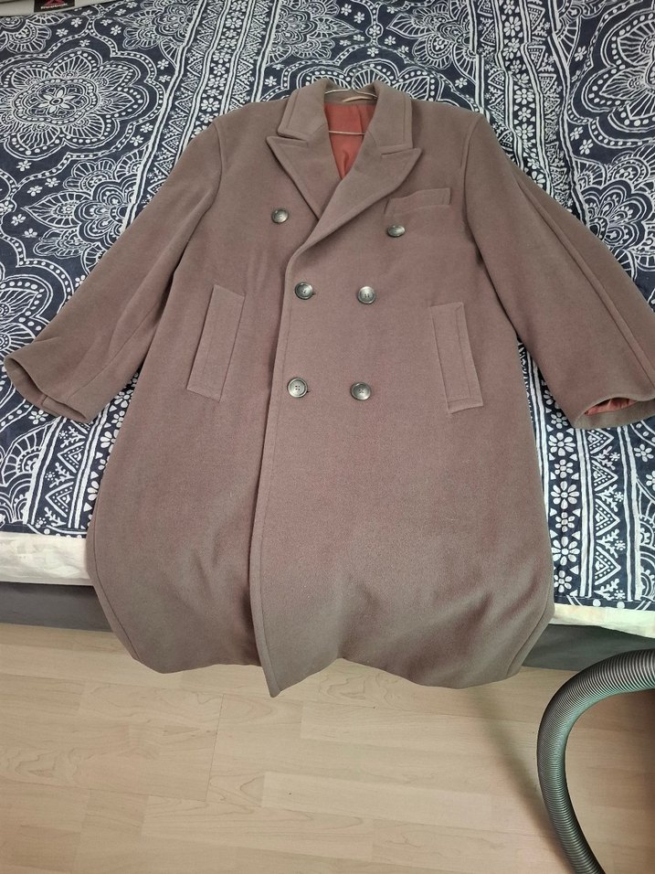 Düğmeli, uzun manto, yaka kısmı kesik ve %100 kaşmir+yün. Düz bej renkte, günlük sokak tarzı için uygun.